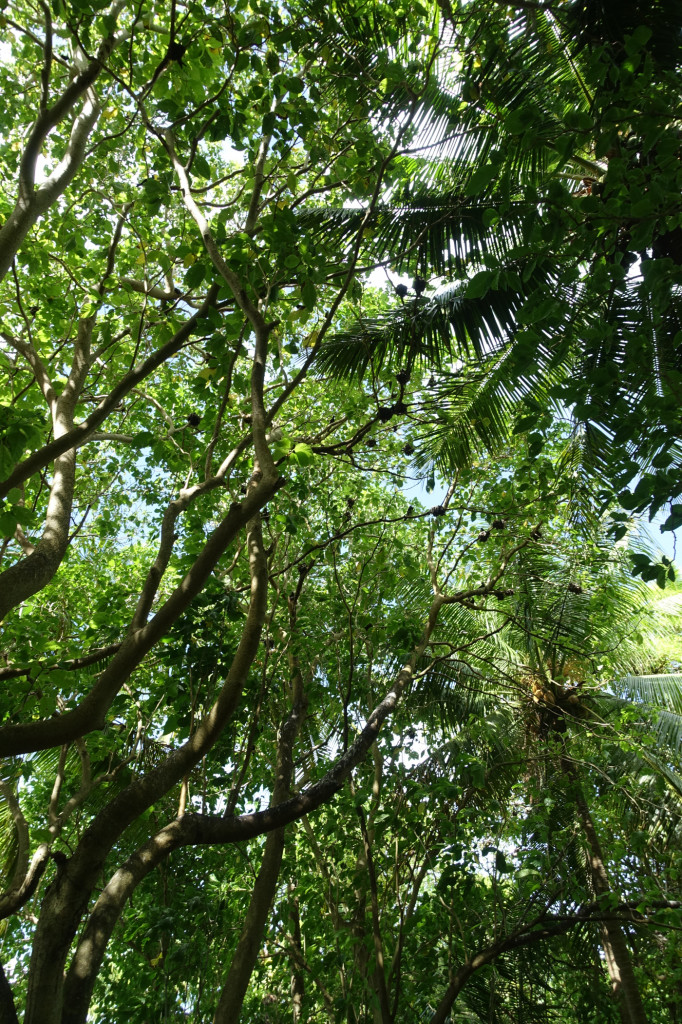 Unfortunately erosion is visibly gnawing on the shore: where older google images still show a beach off the coast the waves are now splashing up right to the trees. We found dozens of sunken trunks close to shore in the lagoon and the next line of palm trees and shrubs has already fallen over again–we witnessed several trees coming down while we were there with high tides during new moon and some southerly swell. Really sad to see rising sea levels and coastal erosion at work: